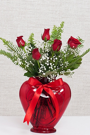 Kalp Vazo İçerisinde 5 adet Kırmızı Gül