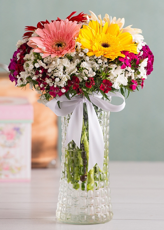 Cam Vazo İçerinde Gerbera ve Kır çiçekleri