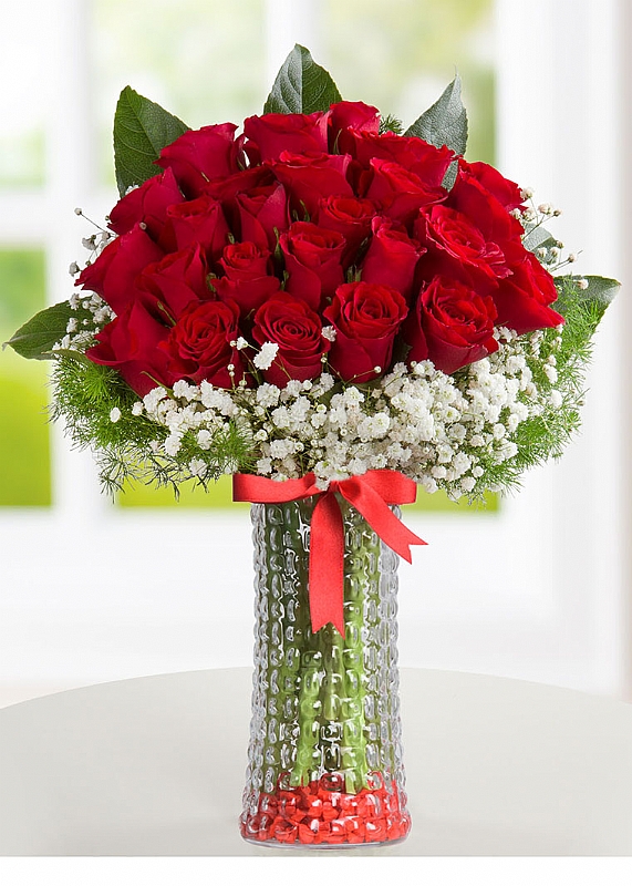 Cam Vazo İçerisinde 25 adet Kırmızı Gül ve Yeşillikler